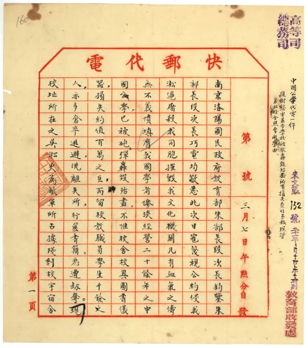 ▲1932年3月7日中国公学为被敌轰毁请拨款补助案致朱家骅等电
