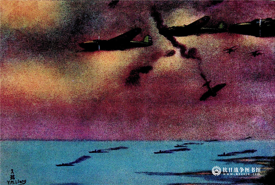 图11-31梁又铭的油画《崇明上空歼敌》,描绘了淞沪会战时中国空军在崇明上空击落日机的一幕。[空画]