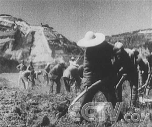 解说:沉寂了多年的荒山野地上第一次升起袅袅炊烟,拿枪的手如今操起镢头,战斗与生产结合起来,生产和学习结合起来,开荒种地,扶犁耕田,都是抗战需要的本领。到1942年底,边区共开垦荒地600多万亩。