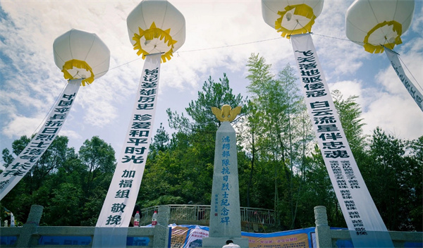 在夏明翰故居东北边不远的牧云峰下,8月份还新落成了一座纪念碑。苍松翠竹环抱的山湾里矗立着一座白色的方尖碑,碑顶有金色造型,中间是张开的降落伞,两旁是展开的双翼,镶嵌着一朵梅花,这就是当年鸿翔部队的徽章标志。纪念碑上用象征天空的蔚蓝色书写“鸿翔部队抗日烈士纪念碑”。背后的工程牌上说明由深圳龙越慈善基金会、衡阳市星光爱心会、衡阳县退役军人事务局、洪市镇政府等单位发起和指导。