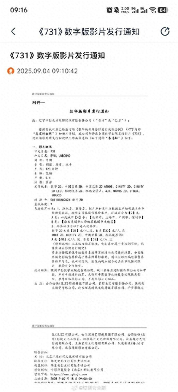 9月4日,据灯塔专业版,影片《731》发行通知出炉,片长125分钟,9月18日上映。