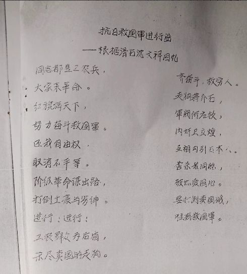 宿松西北山区人民,积极响应党中央的号召,掀起了抗日救国的高潮。罗汉尖被誉为“大别南来第一峰”,自古以来就是兵家必争之地。不仅以其雄伟的姿态俯瞰四野,更以其坚韧的精神成为鄂皖边区的革命堡垒。红二十八军政委高敬亭、皖西特委书记徐成基决定,依托罗汉尖险峻的地势、牢固的群众基础、山区人民对共产党的深厚情谊,开辟罗汉尖革命根据地。1935年11月,成立了以朱育祺为司令的反蒋抗日武装“大中华抗日救国军”,比1937年开始的全面抗战提前两年就举起了抗日救国的旗帜。二十世纪80年代北浴乡滑石村沈文祥回忆,当时,为了宣传革命理想、发动群众、鼓舞人心、激励斗志,朱育祺司令谱写了大中华抗日救国军军歌。90年前,这首抗日救国军歌,在罗汉尖地区回荡。