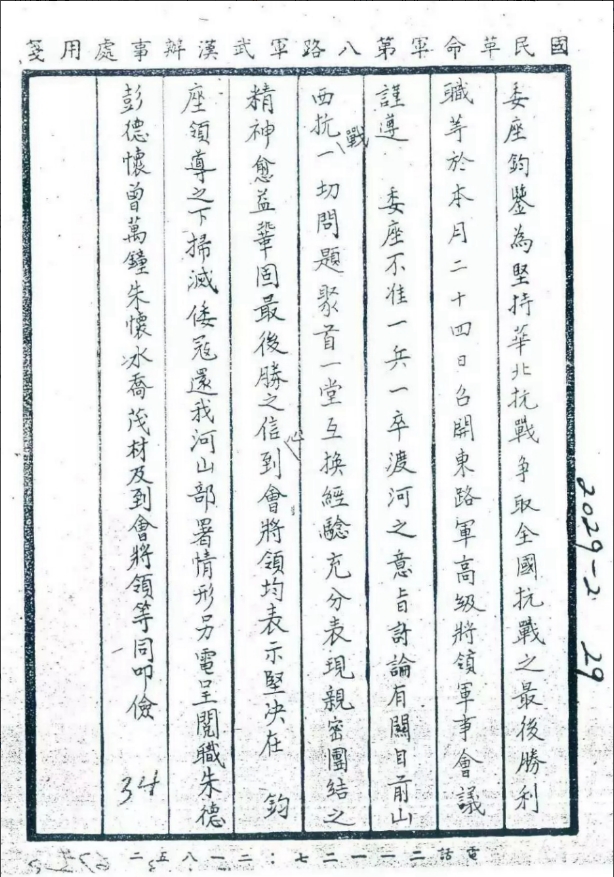 【乔茂材与朱德总司令、彭德怀副总司令等联名致电蒋介石的电报,原件存中国革命军事博物馆】
