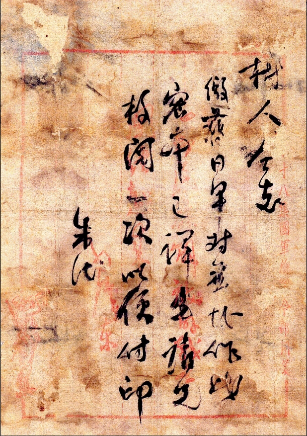 【乔茂材在八路军总部工作期间,朱德写给乔茂材的工作信函。其一: 树人同志:缴获日军对华作战秘本已译出,请兄校阅一次,以便付印。 朱德 其二: 树人兄:兹送来一二九师获得敌人信件摘译一件,阅后请置还。 此致 革命敬礼 朱德 十日十时。】