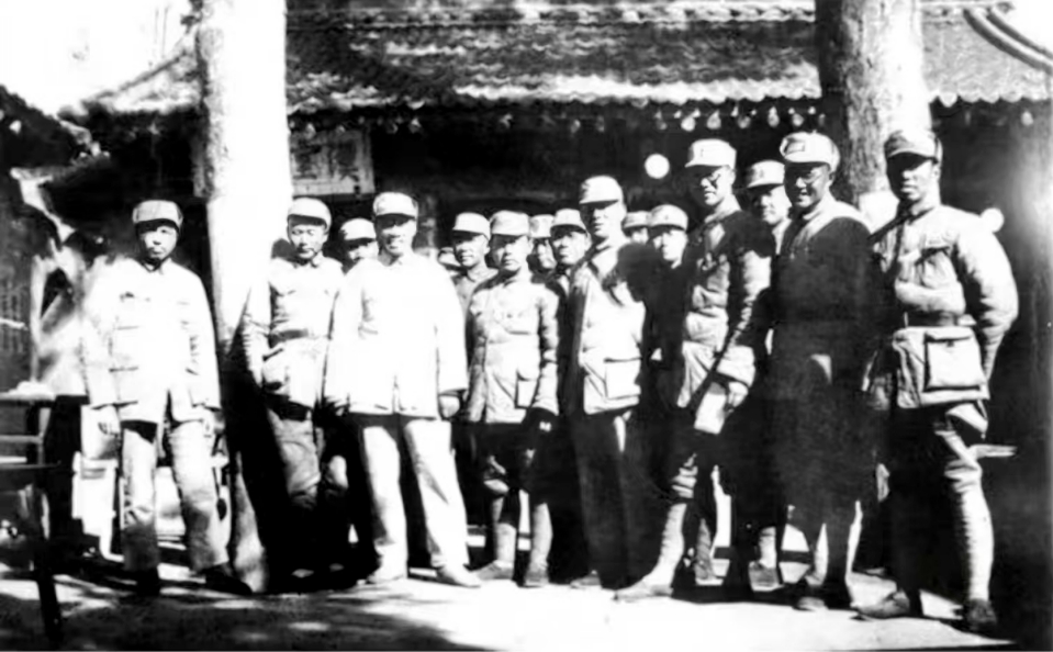 【1938年3月24日-28日,乔茂材在山西沁县小东岭村与出席第二战区东路军将领会议人员合影,朱德(左四)、乔茂材(朱德左手边)、彭德怀(左一)、倪志亮(左二)、刘伯承(右二)、左权(右一)】