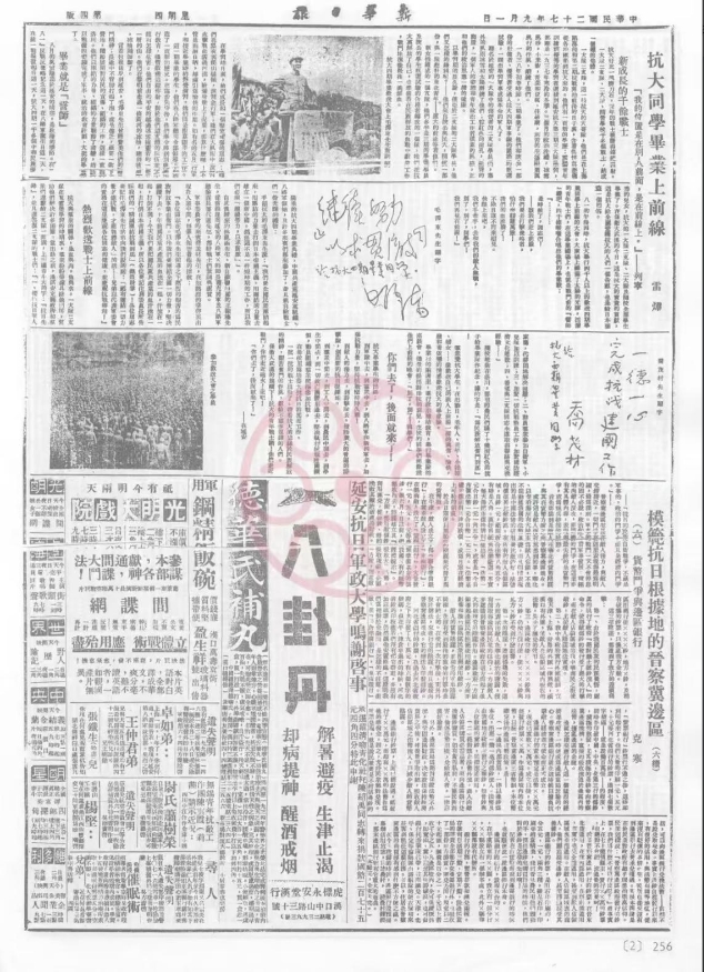 【《新华日报》1938年9月1日第4版。上面有毛泽东、乔茂材的亲笔题字。】