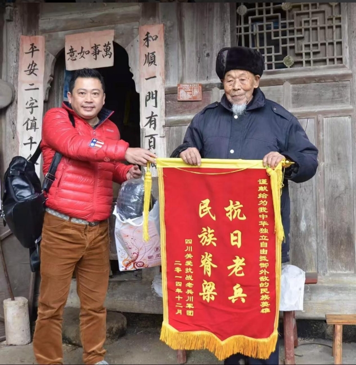 【四川省黄埔后代联工委委员乔育新看望抗战老兵。】