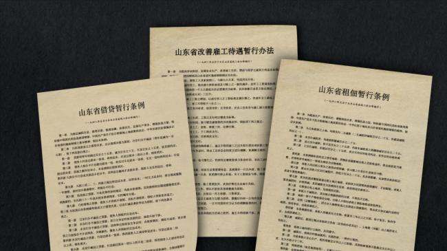 1942年5月15日,山东省战工会公布实施《山东省改善雇工待遇暂行办法》《山东省租佃暂行条例》《山东省借贷暂行条例》