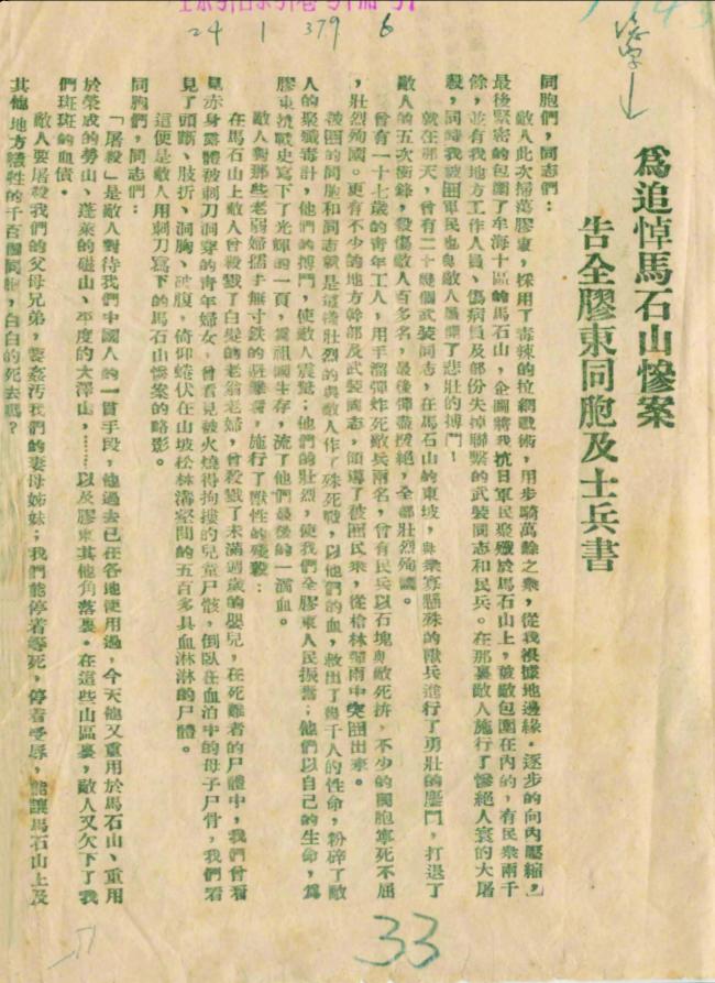 本期档案:为追悼马石山惨案告全胶东同胞及士兵书