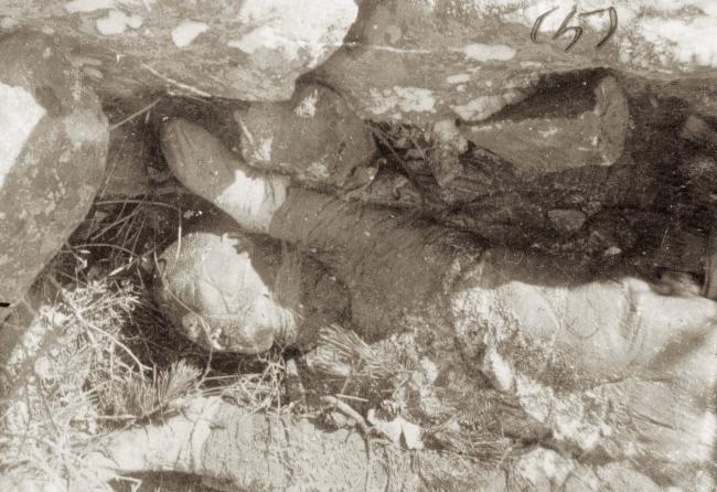 我们曾看见赤身露体被刺刀洞穿的青年妇女,曾看见被火烧得佝偻的儿童尸骸,倒卧在血泊中的母子尸骨。我们看见了头断、肢折、洞胸、破腹,倚仰蜷伏在山坡松林沟壑间的五百多具血淋淋的尸体……
