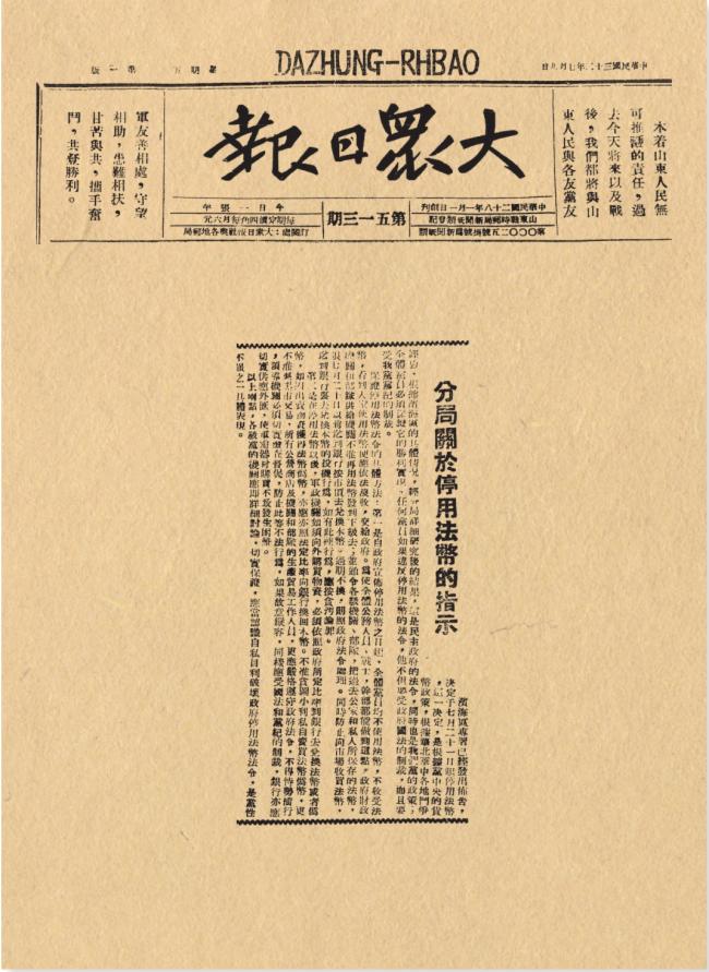 1943年7月9日,《大众日报》刊载中共中央山东分局《关于停用法币的指示》