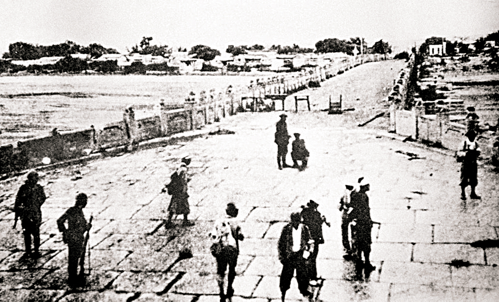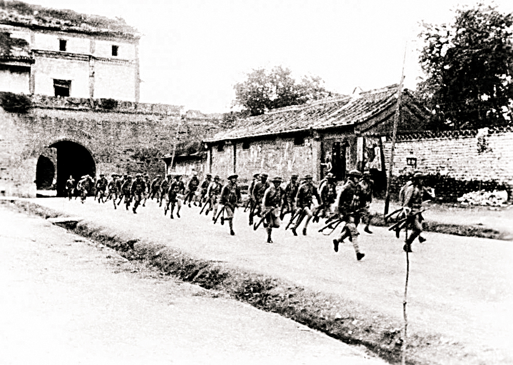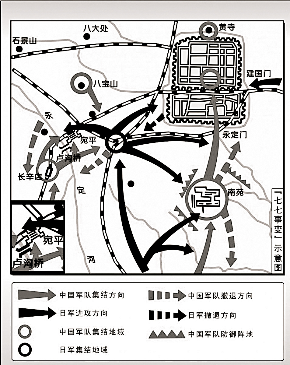 七七事变后,驻守宛平城的中国守军奔赴卢沟桥抵抗日军。
