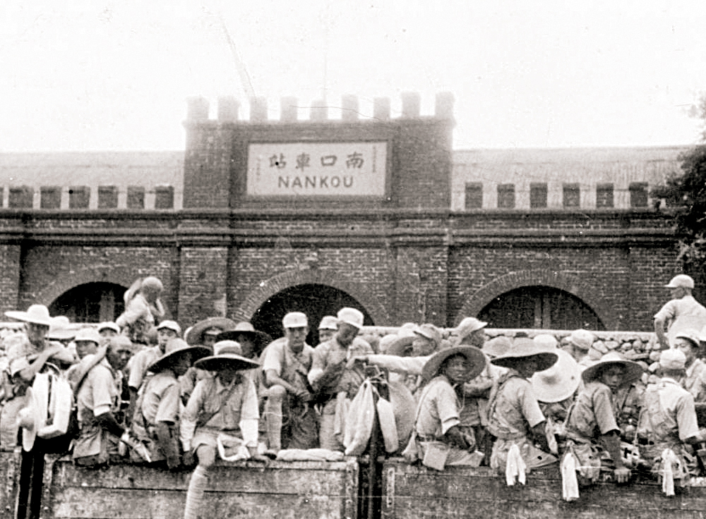 七七事变后,昌平南口火车站门前等待开赴前线的中国士兵。