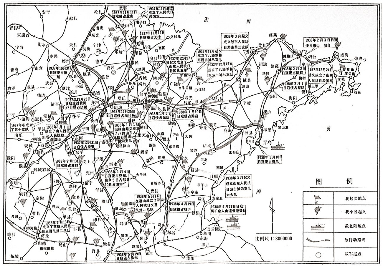 1937年9月25日,中共中央发出“全华北党( 包括山东),应组织发动抗日武装起义,创建自己的武装,开展游击战争”的重要指示。中共中央北方局也发出“每一个优秀的共产党员,应该脱下长衫到游击队去”的号召。中共山东地方组织根据中央指示精神,领导全省人民举行抗日武装起义。图为山东各地人民抗日武装起义示意图。