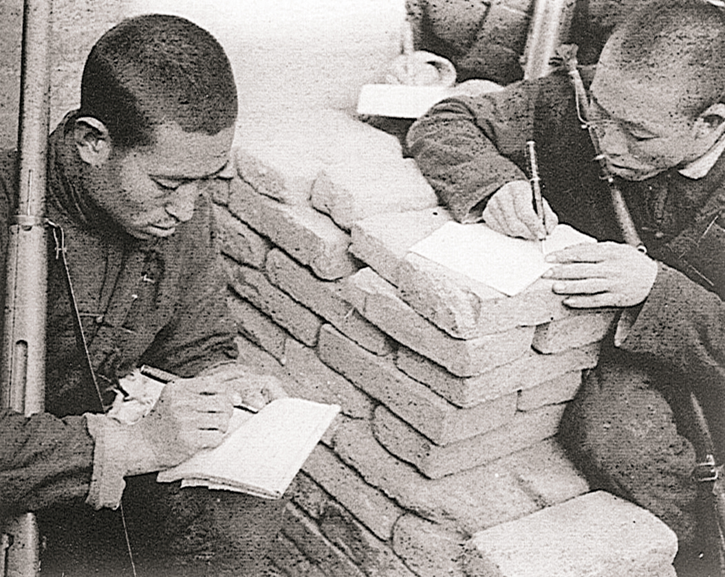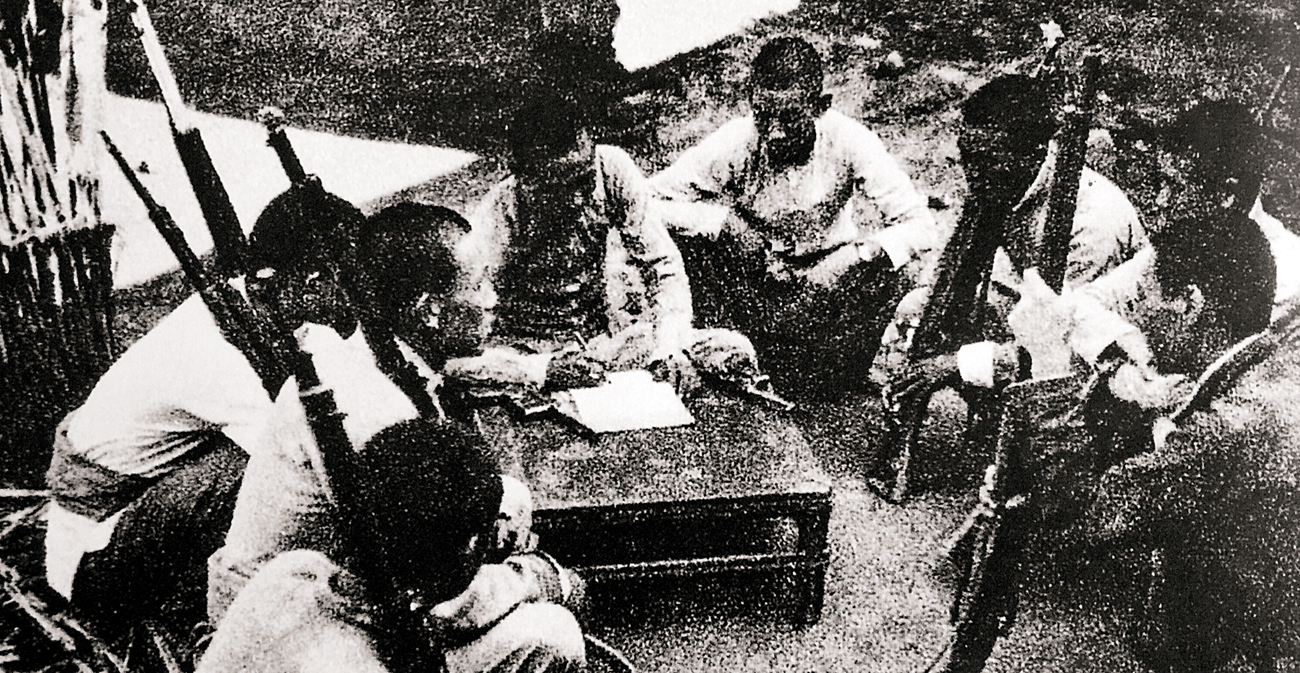 八路军一一五师政治部主任肖华与政治部的同志一起学习马列主义理论
