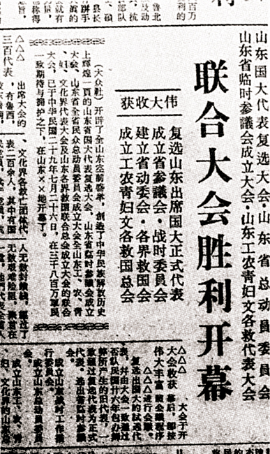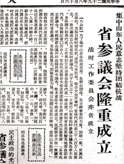 山东抗日根据地推行民主政治,山东省临时参议会成立后,75 岁的著名民主人士范明枢当选参议长,马保三、刘民生为副参议长。图为《大众日报》的有关报道。