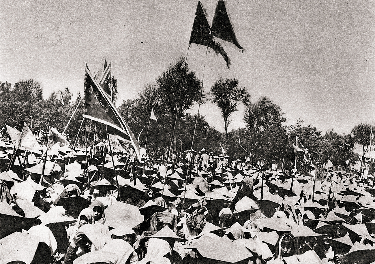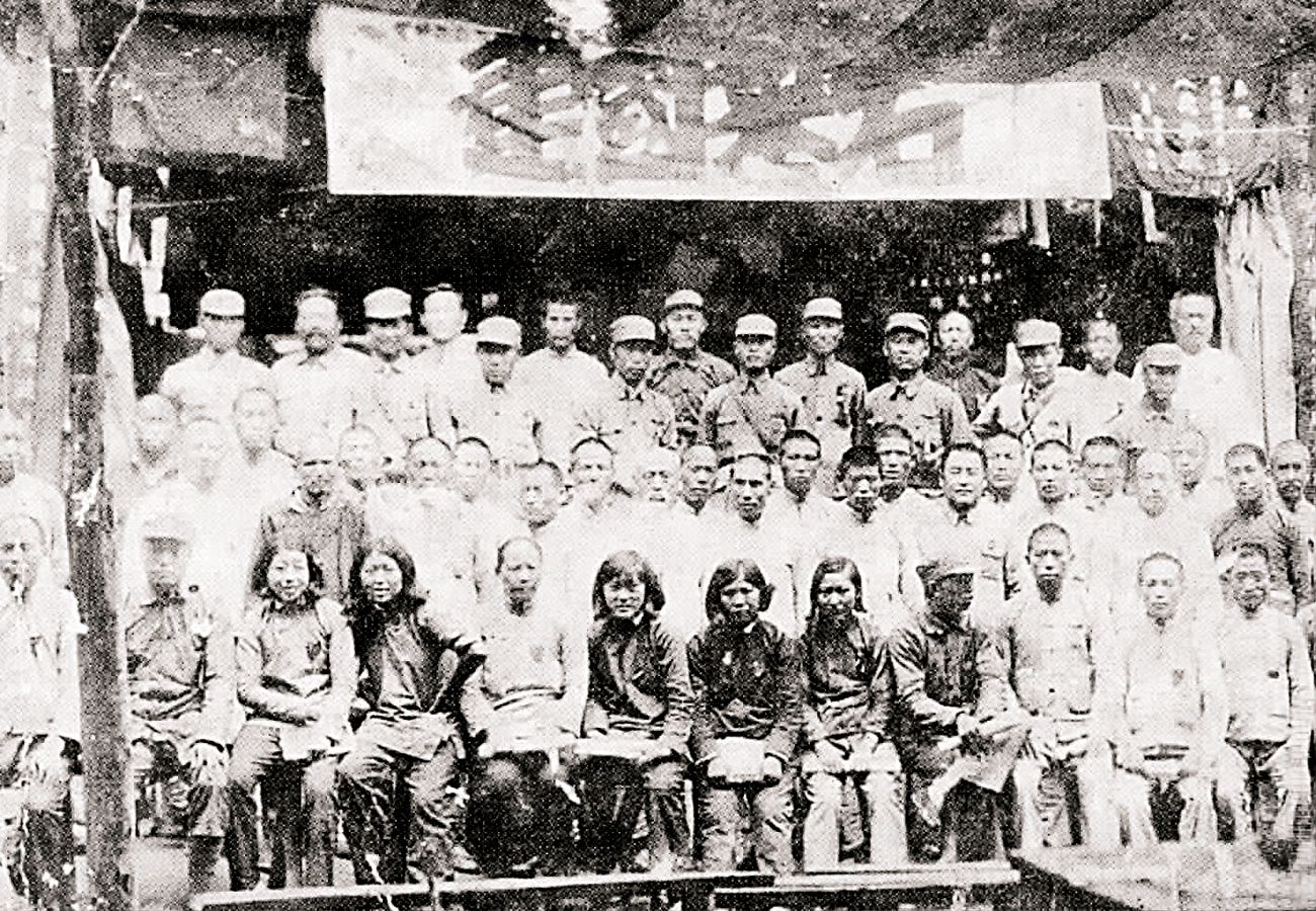 1940年7月26日至8月26日, 山东省国大代表复选大会,山东省民众总动员委员会成立大会,山东省工、农、青、妇、文化各界总会成立大会,山东省各界救国联合会成立大会的联合大会在临沂边县的青驼寺(今属沂南县)召开。山东省临时参议会、山东省战时工作推行委员会以及7个全省抗日群众组织宣告成立。图为山东省联合大会闭幕典礼会场。