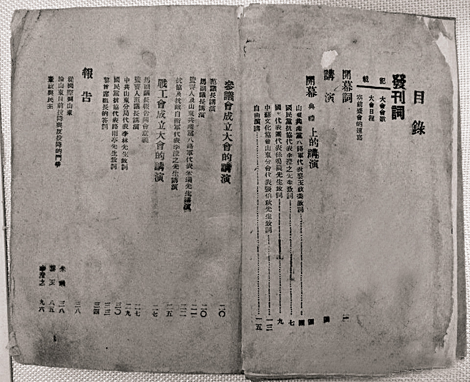 《山东省联合大会材料汇编》详细记载了联合大会召开的盛况,由当时参加会议的山东省临时参议会参议长范明枢汇集整编。主要分为发刊词、开幕词、演讲、报告、工作总结、通电决议宣言、选举、组织章则及行动纲领、大会花絮、闭幕词等部分。