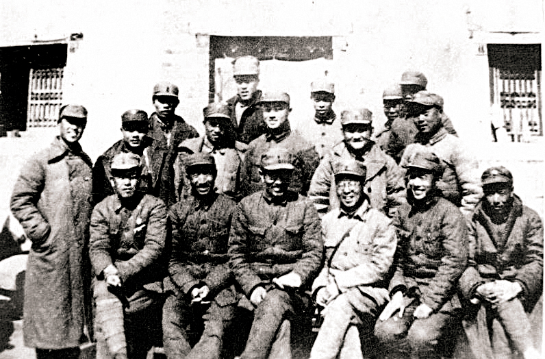 1939年8月1日,八路军第一纵队宣布正式成立。10月14日,其司政机关与八路军山东纵队司政机关合并,领导人合署办公,徐向前、朱瑞以八路军第一纵队名义直接指挥八路军山东纵队所属部队,番号保留。图为1939年8月,八路军第一纵队司令员徐向前(前排右五)、政委朱瑞(前排右四)与八路军山东纵队政委黎玉(前排右六)等合影。