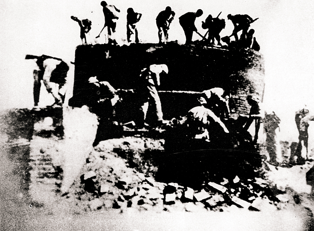 八路军东进抗日挺进纵队组成后,连续取得津浦铁路破袭战以及三打灯明寺、孟村、韩家集、大宗家等战斗的胜利,部队发展壮大到1.5万余人,迅速打开了该地区抗战的新局面。图为灯明寺战斗后, 抗日军民拆除日军炮楼。