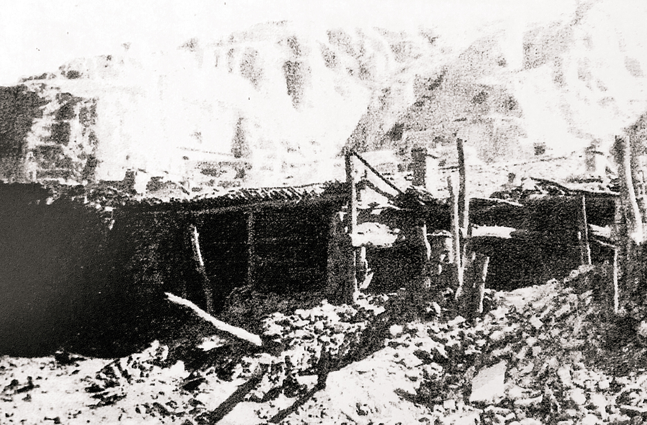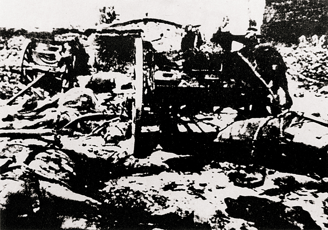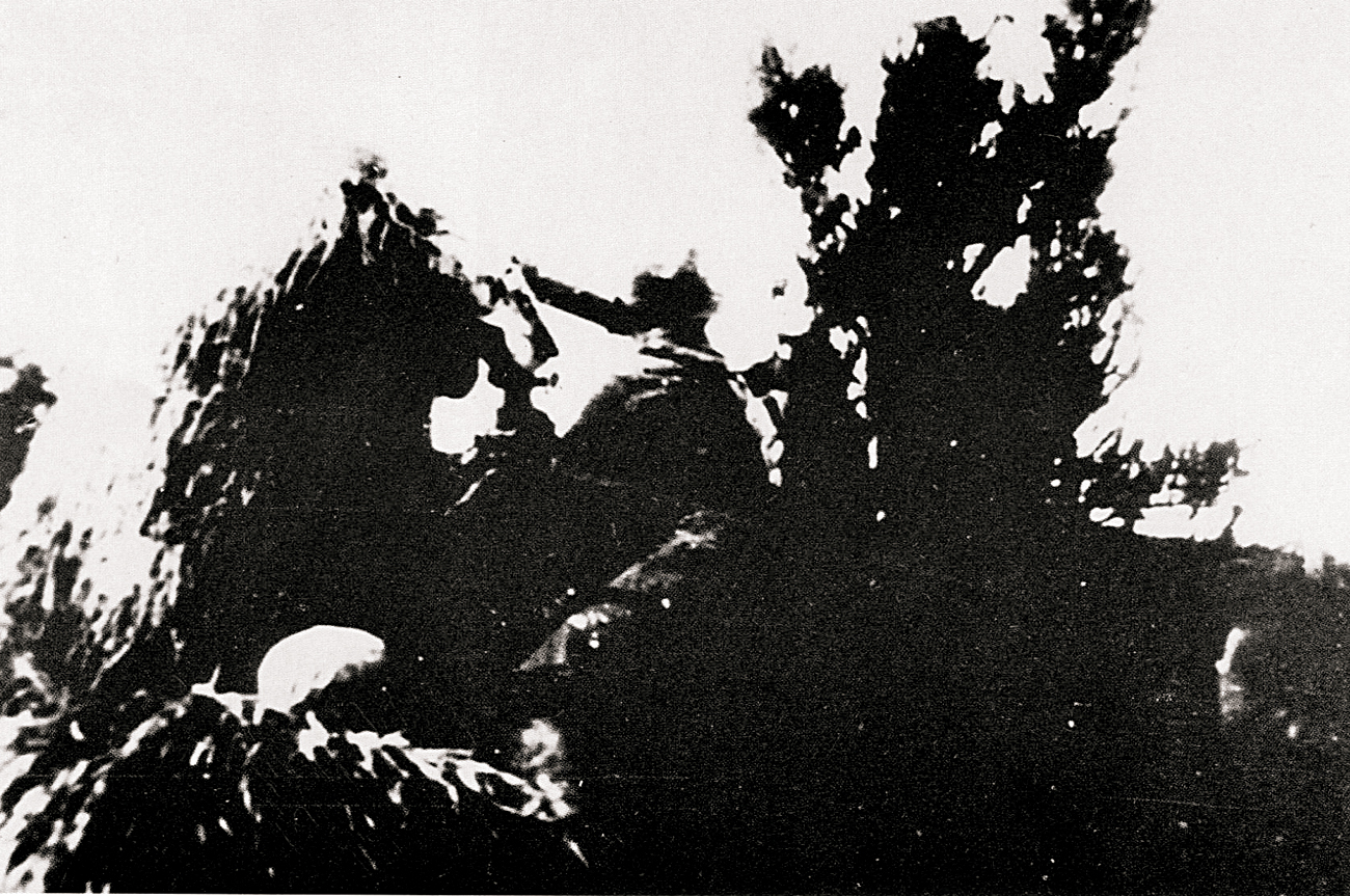 1939年冬,罗荣桓(左一)在费县聂家庄用梁山战斗中缴获的日军炮对镜观察敌情。