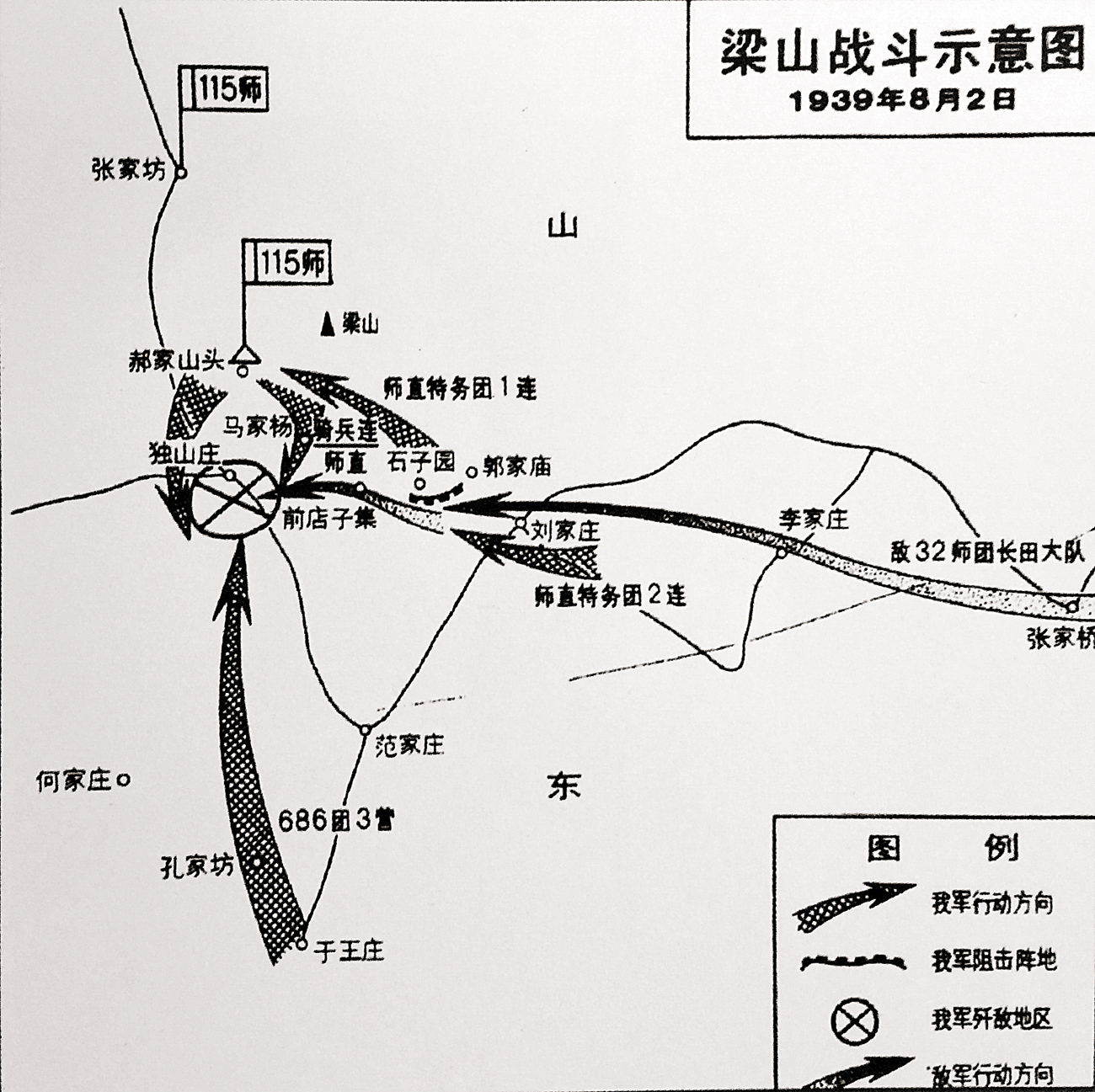 1939年8月,八路军一一五师独立旅一团三营等部在陈光、罗荣桓领导下,在梁山西南独山庄伏击日军,歼灭日军1个大队, 共300余人。图为梁山战斗示意图。