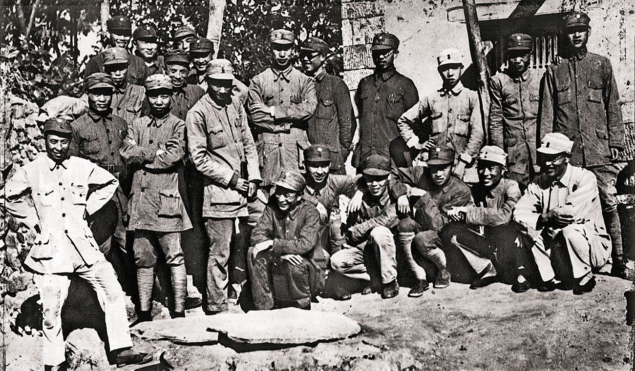 1940年9月,八路军一一五师在鲁南天宝山区的桃峪召开高级干部会议。图为罗荣桓(二排右四)、朱瑞(前排右一)与参加会议人员合影。