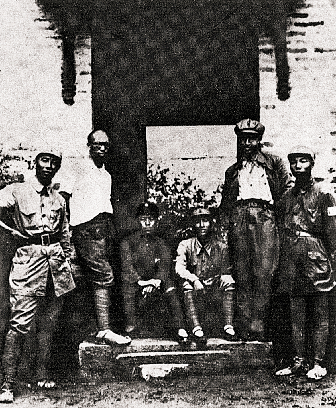 1939年9月,八路军一一五师抵达鲁南抱犊崮山区。图为肖华(前排左一)、陈光(前排左二)、邝任农(前排左三)、杨勇(后排左一)、朱瑞(后排左二)、王秉璋(后排左三)在鲁南根据地合影。