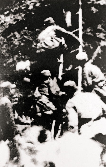 1944年8月24日,八路军山东军区胶东军区部队攻克牟平县水道据点,歼灭日军38人,伪军两个中队。图为攻克水道据点的战斗模范手持缴获的机枪留影。