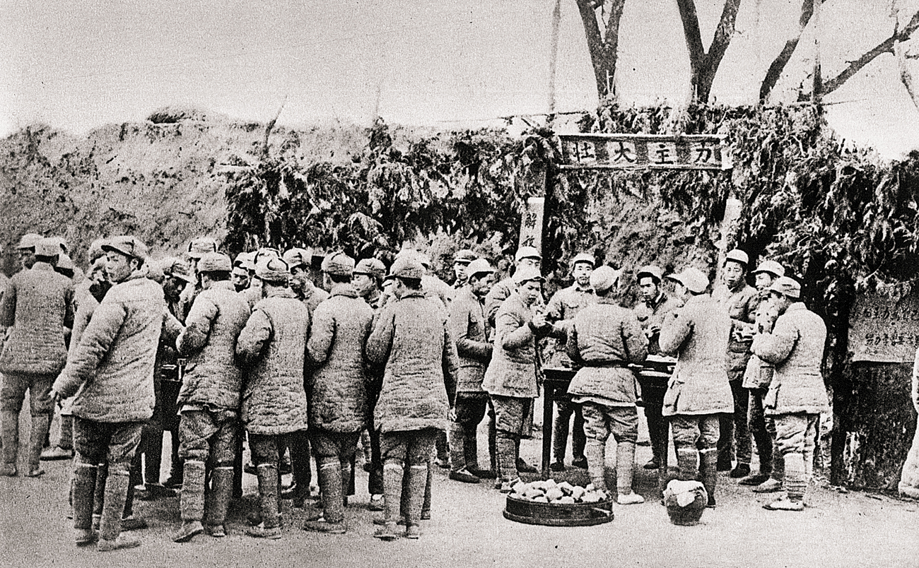 1945年春,人民抗日武装地方部队升入主力部队进行会餐。