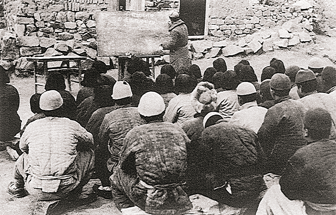 八路军部队文化教员帮助群众识字,提高文化水平。