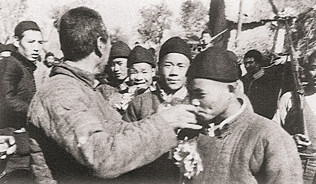 山东各地掀起了大规模参加八路军的热潮,人民群众为新战士戴光荣花。