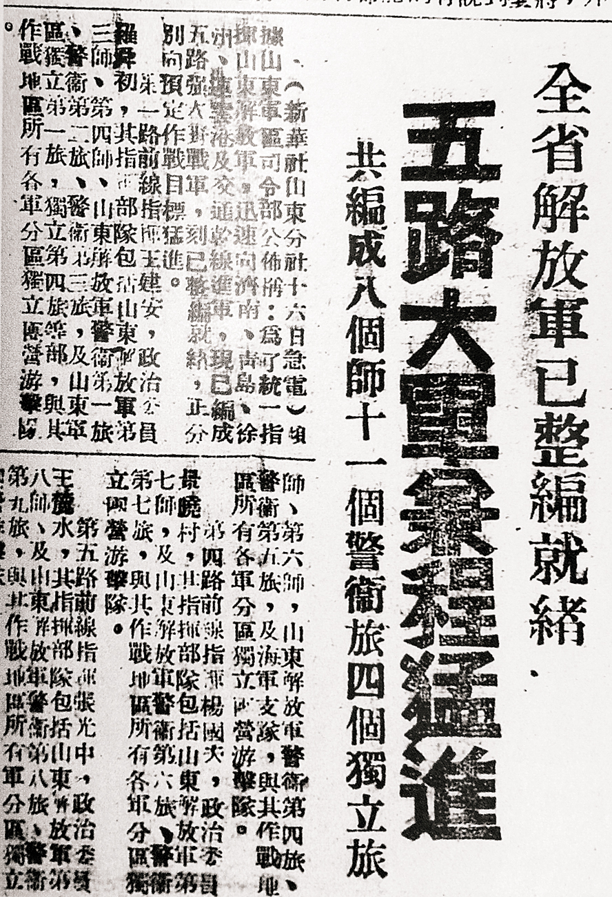 1945年8月9日,毛泽东发表《对日寇的最后一战》声明。八路军山东军区所属各部队编成五路大军,向拒绝投降的日伪军发动强力攻势。图为《大众日报》的有关报道。