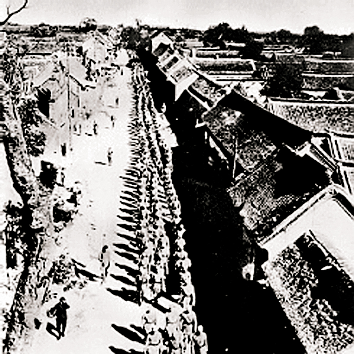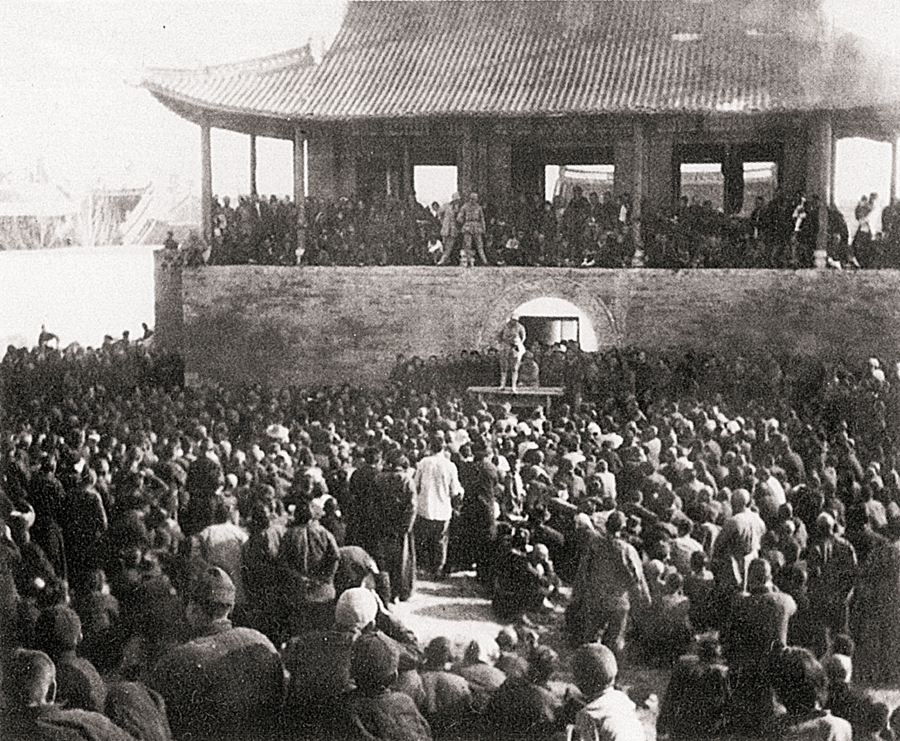 临沂城解放,军民在城隍庙前举行庆祝大会。