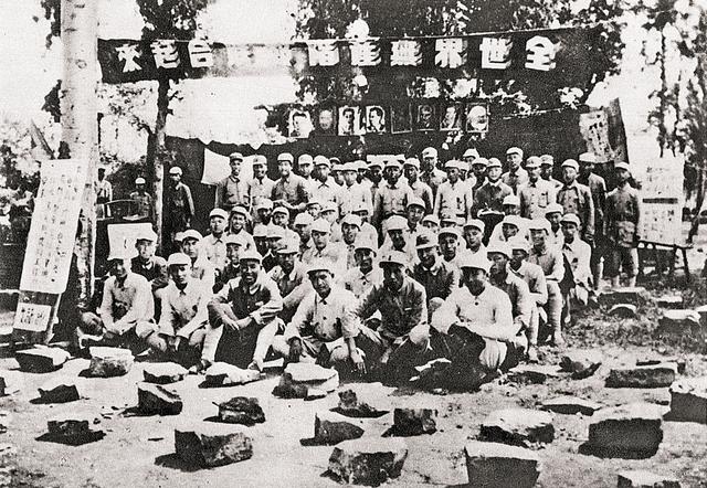 左前:黎玉、刘少奇、肖华、罗荣桓、左后:周长胜、梁兴初、杜明1942年夏在山东朱樊镇