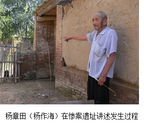 村民区朝修正在庄西头地里干活,远远看见日军来了,就急忙往村里跑,见区马水还在锄地,忙喊道:“快跑啊,鬼子来了”,区马水跑得慢,被日军追上,连刺几刀,倒在血泊中,他还想站起来,又被日军朝胸口“扑嗤”一刀,刺死了。