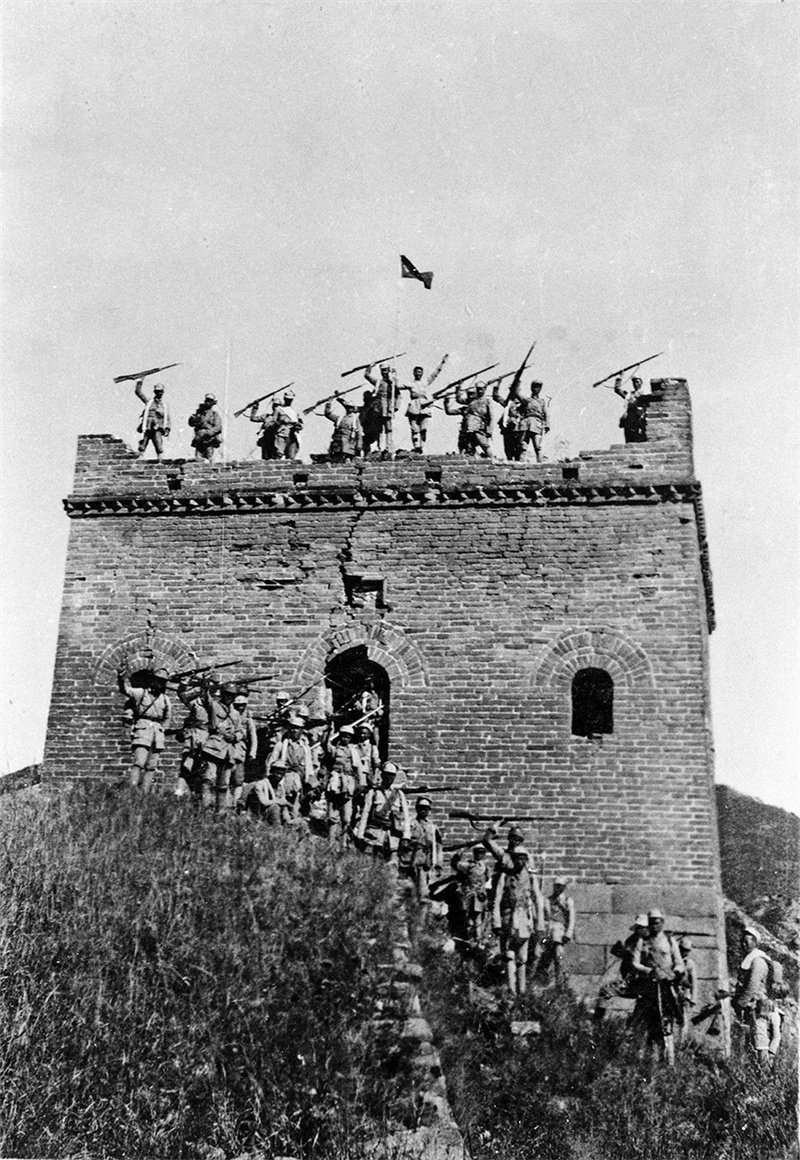 八路军攻克河北涞源县日军据点东团堡后,战士们在长城烽火台上欢呼胜利。
