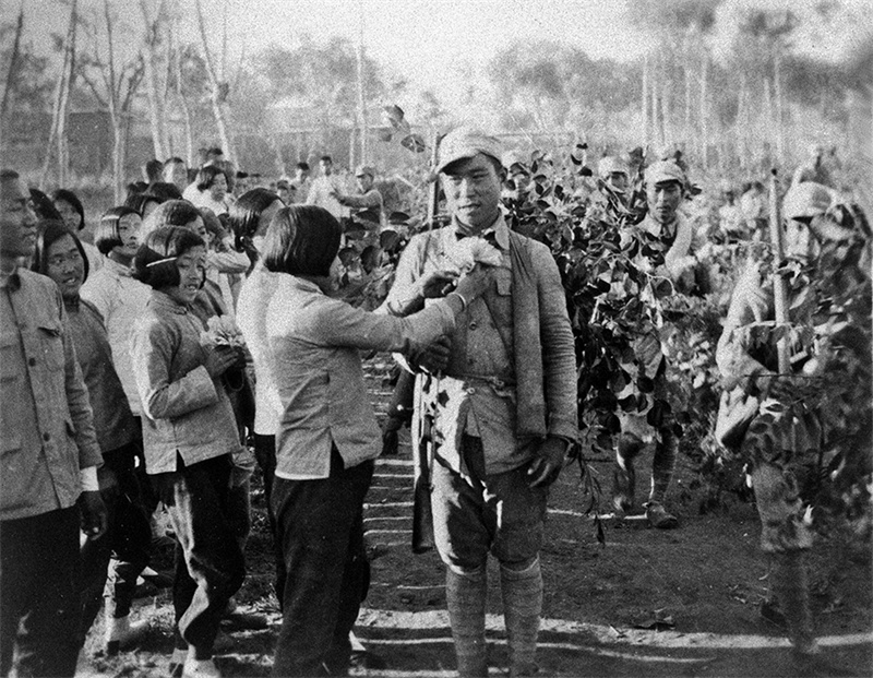 抗日根据地群众热烈欢迎参加百团大战的将士们凯旋。