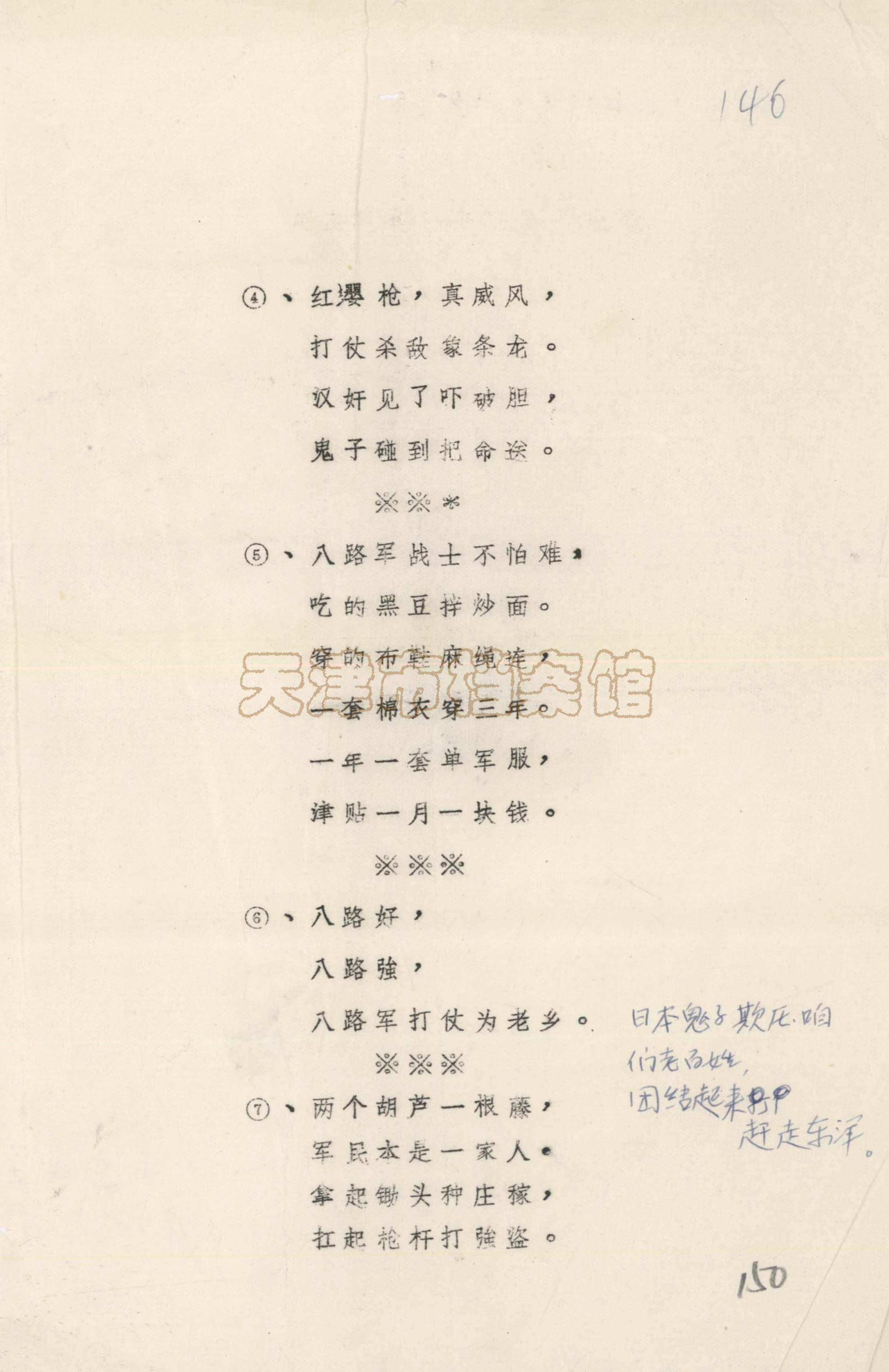入选理由:1937年天津沦陷后,天津城市抗日斗争转入地下,盘山的抗日武装斗争兴起。这几首抗战歌谣反映了盘山军民以各种形式开展对敌斗争的情况,朗朗上口,生动形象,表达了盘山人民不畏强敌、敢于斗争的爱国情怀,是记录这一段历史的生动史料。
