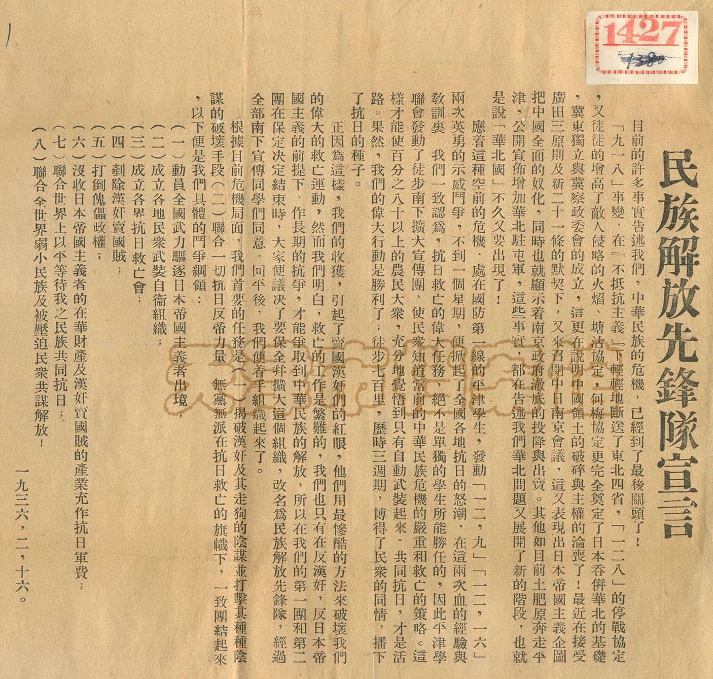 1936年2月1日,中国共产党领导的以抗日民主为目标的全国性先进青年群众组织——民族解放先锋队(后改名为中华民族解放先锋队,简称民先或民先队)成立。3月上旬,中华民族解放先锋队天津地方队部成立于南开大学。图为民族解放先锋队成立宣言。