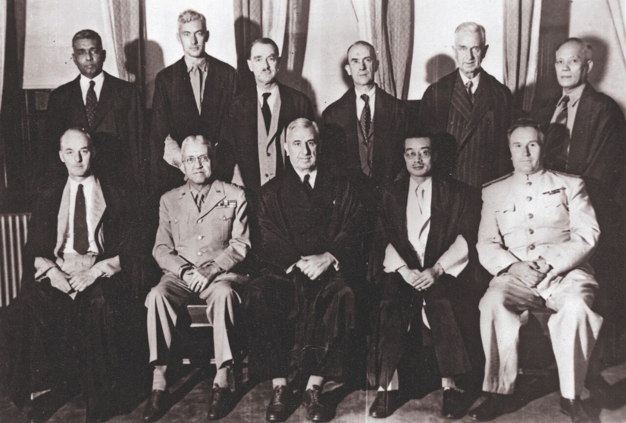 远东国际军事法庭11国法官合影,梅汝璈为前排右二。 新华社发