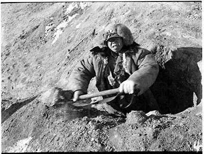 绥远前线挖战壕的中国年轻士兵。一位只有十几岁的少年,国恨家仇使他拿起武器走向杀敌战场,面对即将打响的战役,他面带笑容、毫无畏惧。方大曾摄于1936年12月。