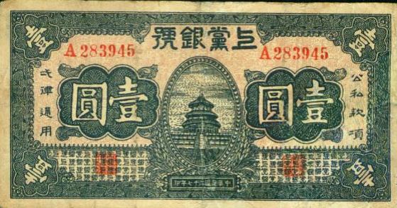 1938年,为了独立自主地发展和巩固根据地,严防蒋介石、阎锡山经济封锁,晋东南抗日根据地在沁县成立上党银号,发行上党票。上党票初发行时与法币、晋钞、银元以及根据地各县银号发行的县票同时流通于晋东南、晋南、晋中、冀南等部分县域,1938年发行的面额有拾元、伍元、贰元、壹元、伍角、贰角伍分、贰角、壹角等8种票面10种版别。壹元票的主图设计为体现根据地货币特色,天坛主图的下面倒印有一“党”字暗记。1940年初,上党银号结束,其财产并入冀南银行时,共发行上党票300余万元。