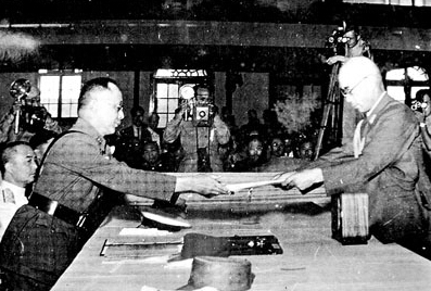 余等兹对合众国、中华民国、及大不列颠帝国,各国政府首脑,于一千九百四十五年七月二十六日于波茨坦宣而尔后由苏维埃社会主义共和国联邦之参加宣言条款,并根据日本政府,天皇,及日本帝国大本营之命令代表受诺之。右述四国以后称之为联合国。余等兹布告,无论日本帝国大本营,及任何地方所有之日本国军队,与夫日本国所支配下一切军队,悉对联合国无条件投降。