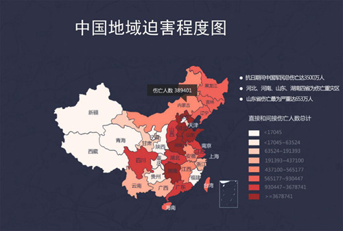 日军犯罪行为版图包括A级战犯控制势力图、日军侵华事件图和中国地域迫害程度图,用图结合数据的形式来直观体现日军在华犯下的罪行。在日军侵华的地域迫害程度图中,每个省份根据直接和间接伤亡总人数的迫害程度严重性分八个跨度,颜色由浅渐深。下图可见,日军的迫害范围波及了大半个中国,其中在华北地区造成的破坏最大,伤亡人数远远超出其他区域。从省份划分上来看,伤亡最严重的省份分别是河北、山东、河南和湖南,四个省的直接和间接伤亡总人数均超过367.9万人。