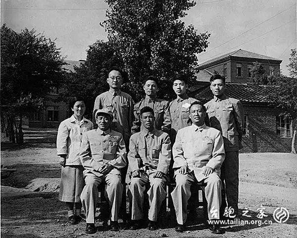 1956年6月10日,陈弘(后排左二)等工作人员在太原与最高人民法院军事法庭审判日本战犯工作的领导合影。前排左起:井助国、谭正文、冯荣昌。(陈弘供图)
