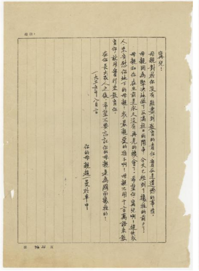 宁儿,母亲对于你没有能尽到教育的责任,实在是遗憾的事情,母亲因为坚决地做(作)了反满抗日的斗争,今天已经到了牺牲的前夕了,母亲和你在生前是永久没有再见的机会了。希望你,宁儿啊!赶快成人,来安慰你地下的母亲!我最亲爱的孩子啊!母亲不用千言万语来教育你,就用实行来教育你。在你长大成人之后,希望不要忘记你的母亲是为国而牺牲的!