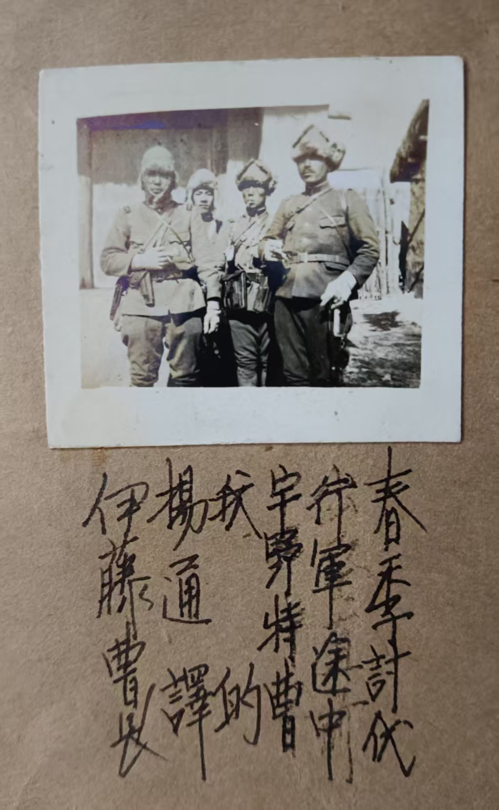 图中的杨通译,即杨靖宇部的叛徒,为日军作翻译领路人。与已经发布的照片比对,此汉奸为张秀峰(左二)。左一为伊藤军曹,被杨靖宇于2月15日将其击毙。