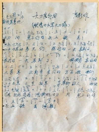 时隔78个春秋,6月18日,在地处内蒙古东部农牧区的通辽市开鲁县麦新纪念馆,我们见到了麦新当年留下的《大刀进行曲》手抄底稿(见右图,杨明方摄)。