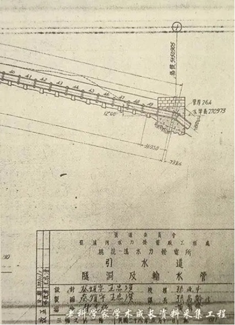1940年前后,张光斗在四川龙溪河为兵工厂设计建成了一批水电站。他的婚礼就在工地举行。图为1939年他设计的桃花溪水电站引水道设计图。